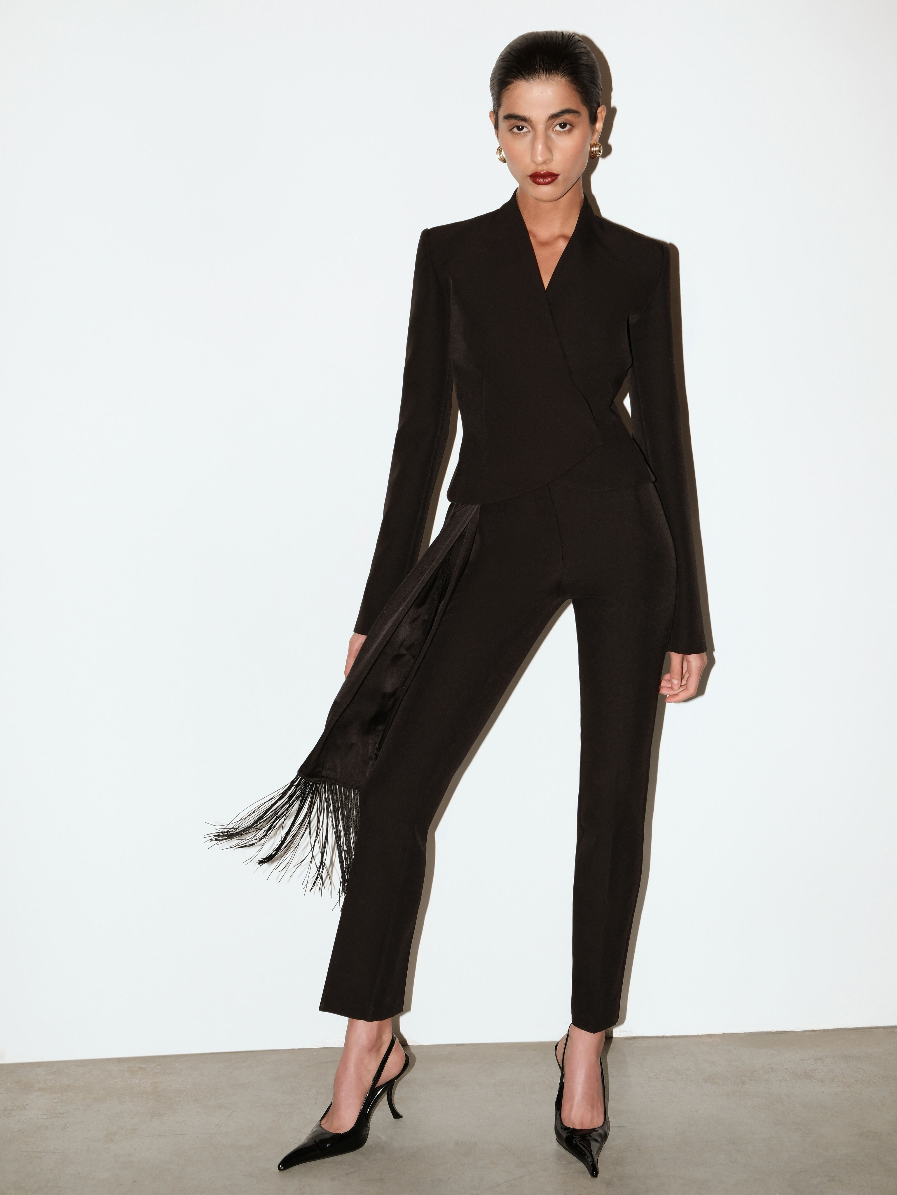 Стрелки визуально вытягивают силуэт и придают образу более собранный характер. Модель дополнена шлёвками для ремня и выполнена в лаконичном, минималистичном дизайне без лишних деталей и карманов, что сохраняет чистоту линии и акцент на посадке.