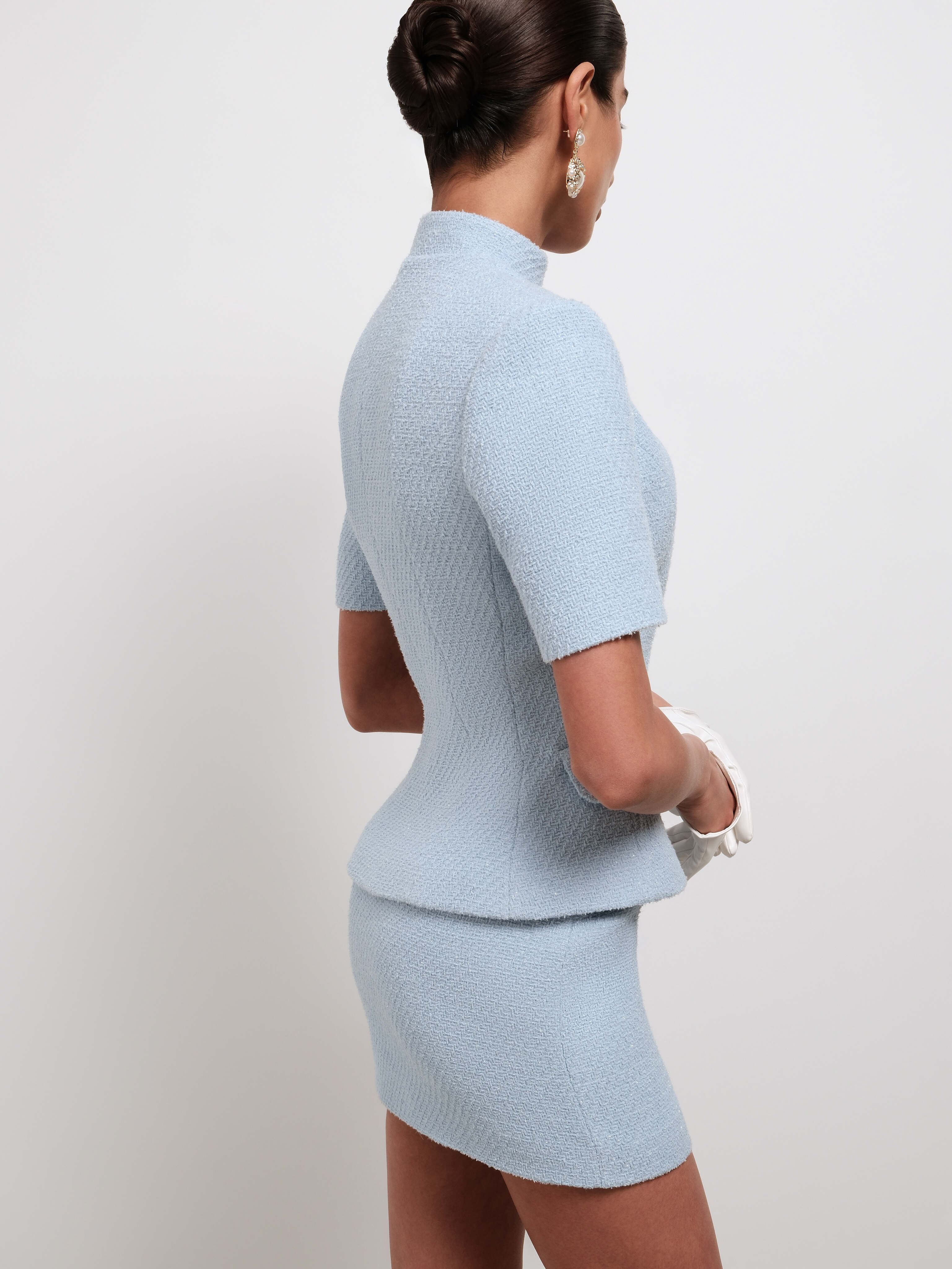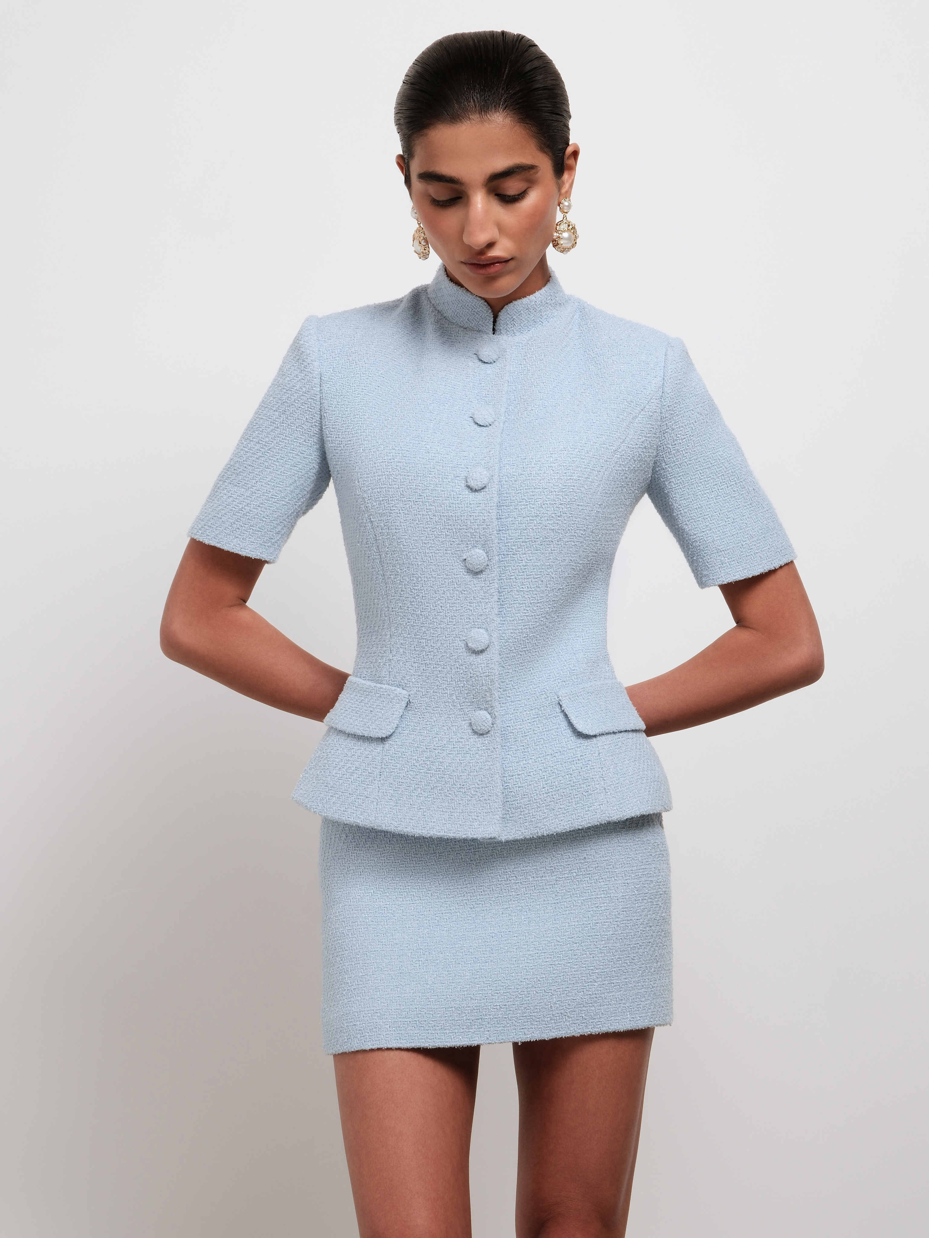 Красивый нежно-голубой оттенок жакета, который освежает образ и подчёркивает его утончённый характер.